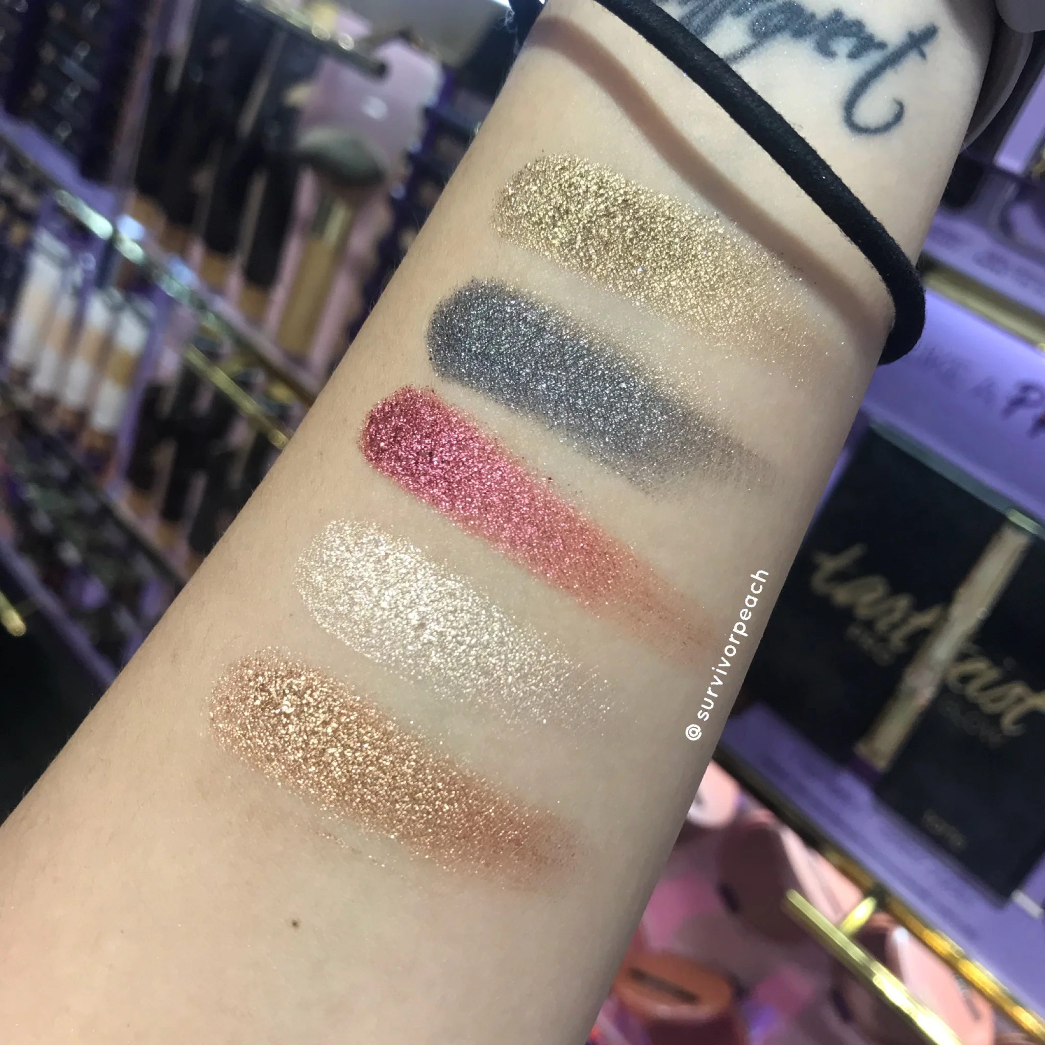 Tarte Chrome Paint Shadow Pots Swatches- Martini, Steel the Show, Fire Dancer Top Yatch, Park Ave Princess
