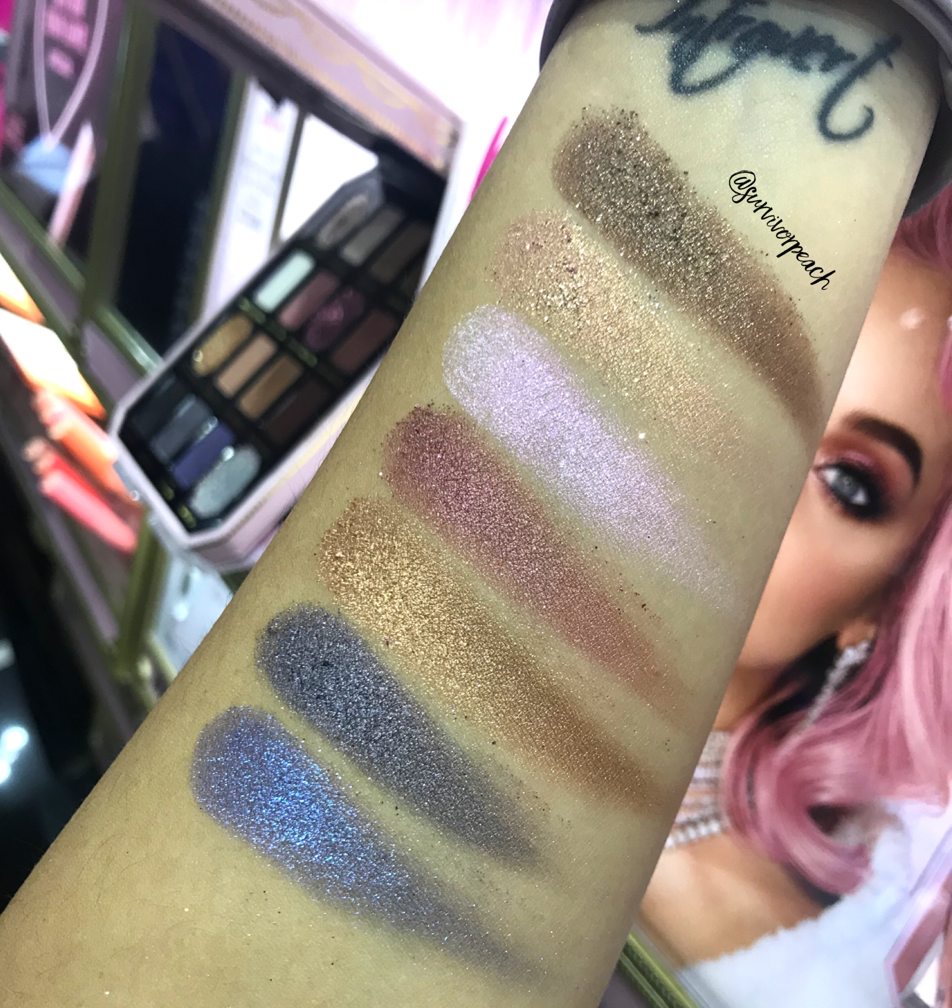 Swatches of the Toofaced Pretty Rich Diamond Light Eye Shadow palette