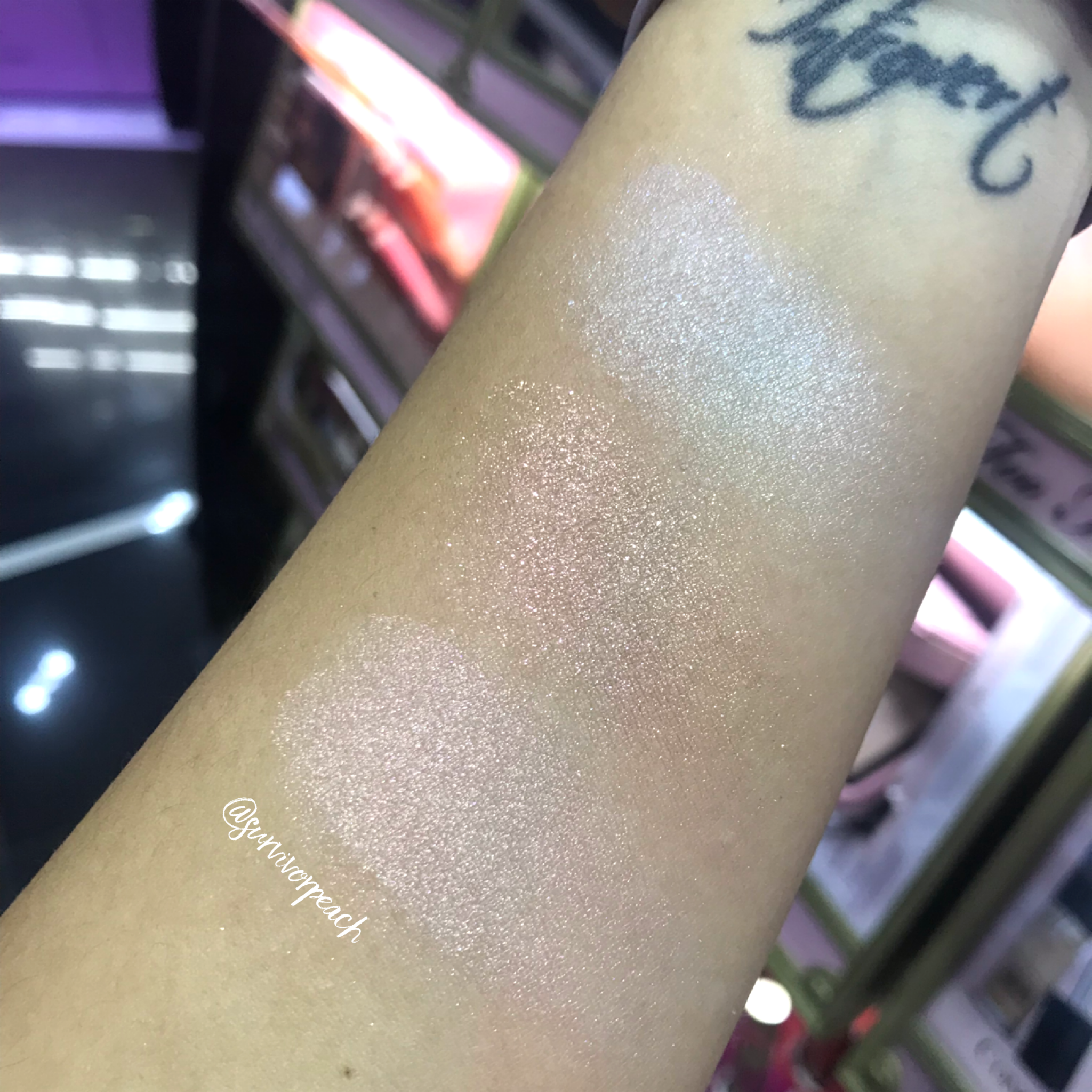 Swatches of the Too faced Diamond Fire, Canary Diamond and Fancy Pink Diamond Highlighter