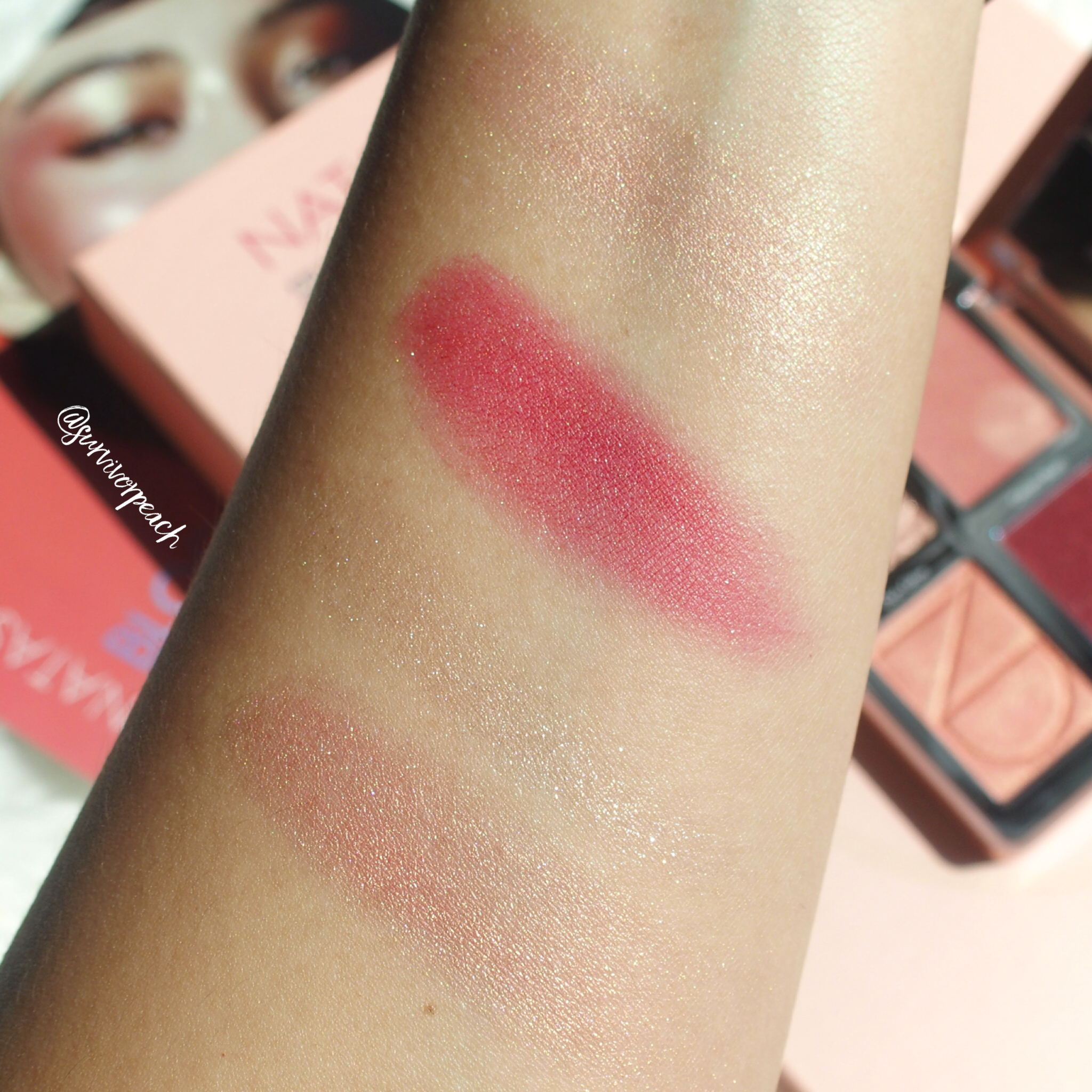 Here are closer swatches. You can see that the Glow Cream Base in shade Natural Peach (top) is quite subtle. I’d love to use this on the highs of my face.