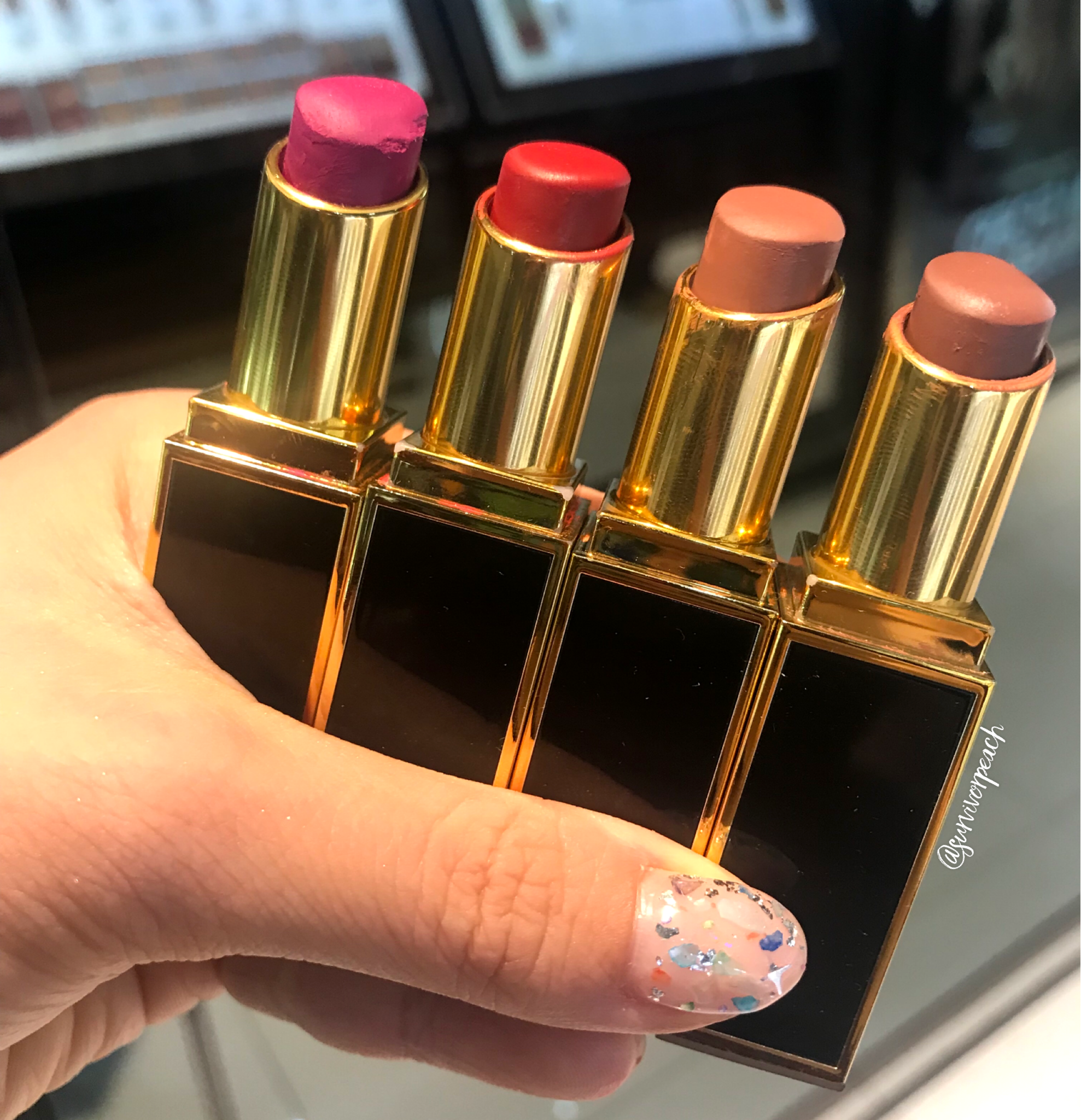 Tom Ford Lip Color Satin Matte Swatches - 02 La Nudite, 03 Blow Up, 04 Manhattan Rose, 05 Peche Perfect