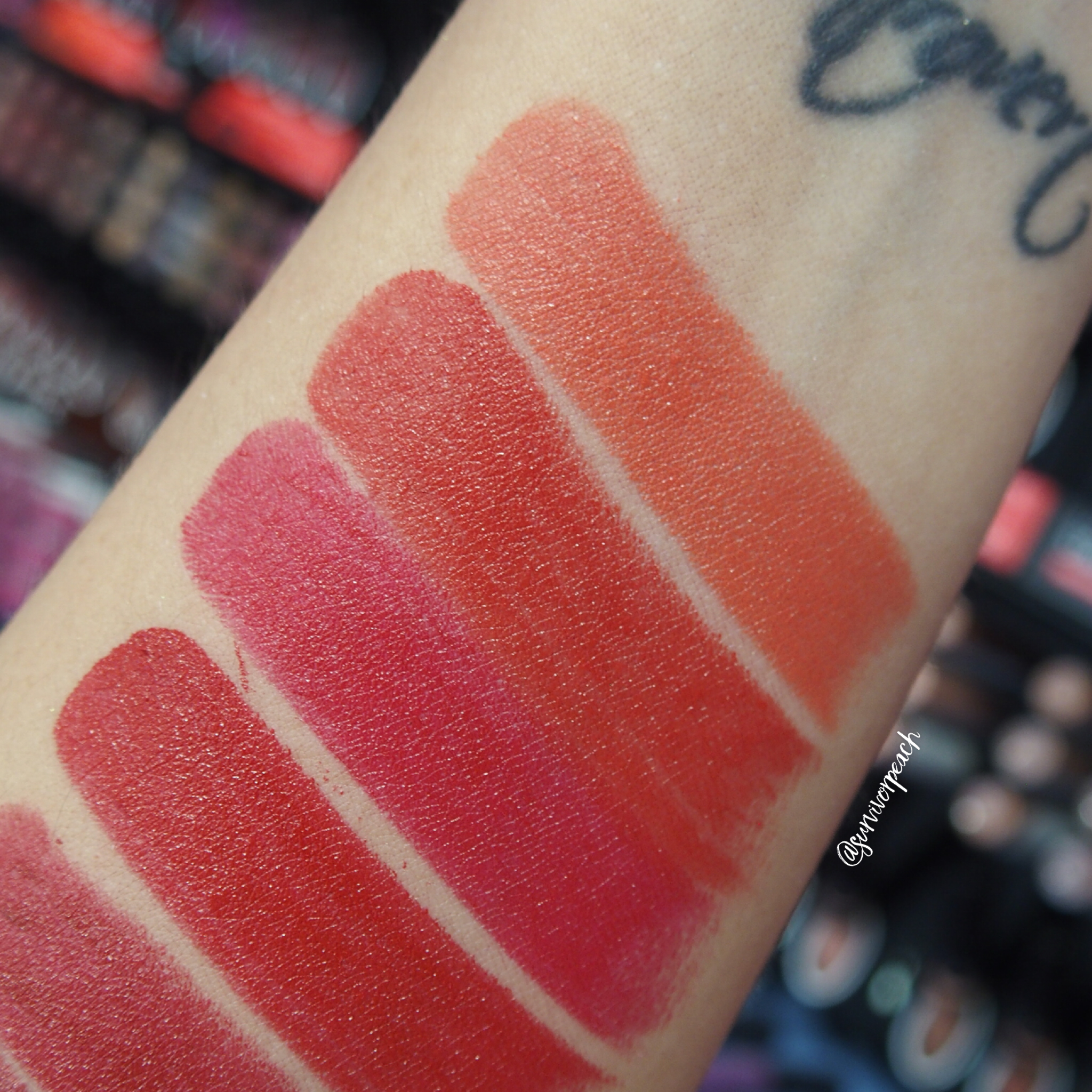 Sephora Collection Rouge Satin Lipstick swatches - S10 What’s Up?, S11 Night Call, S12 On My Way, S13 Feeling Free, S18 Oh Oh!